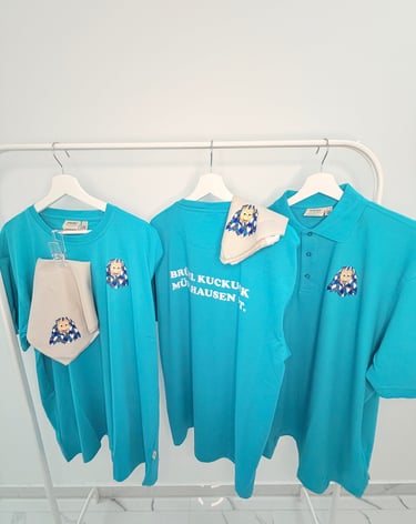 Der Verein verwendet Arbeitsshirts der Marke Hakro, welche wir wunschgemäß besorgt haben. Die Textilien haben wir mit unserem zertifizierten DTF-Druck bestehend aus dem Brühl Kuckuck Logo sowie deren Name als Druck veredelt. T-Shirt, Polo-Shirt und Halstuch bereit für die Fasnet.